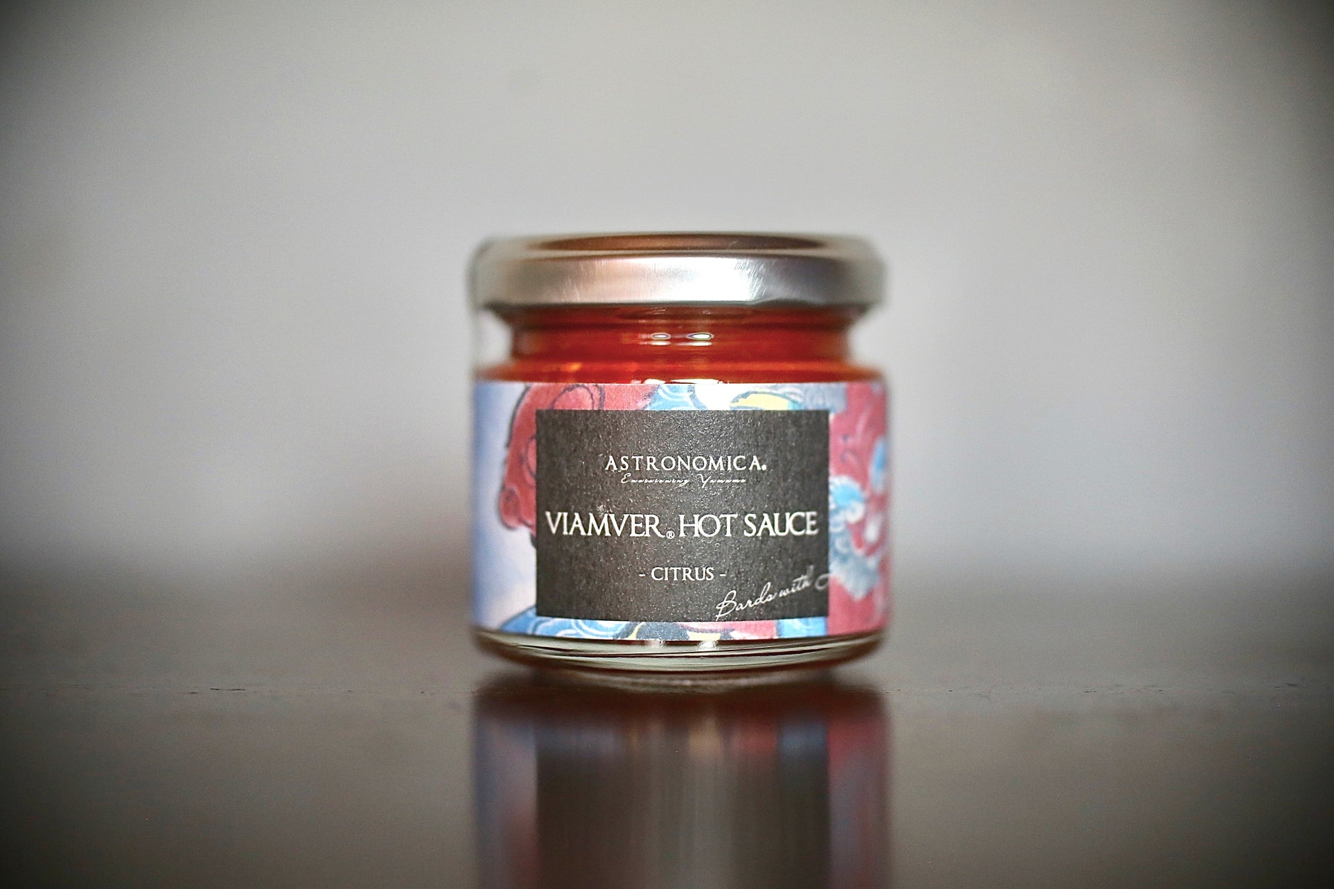 うま味を醸成するViamver酵母を作用させたシトラス香るホットソース。辛味と柑橘の香りとタンニンの渋み、コハク酸のうま味と西洋だしをあわせた発酵調味料。辛味を食事のアクセントに。