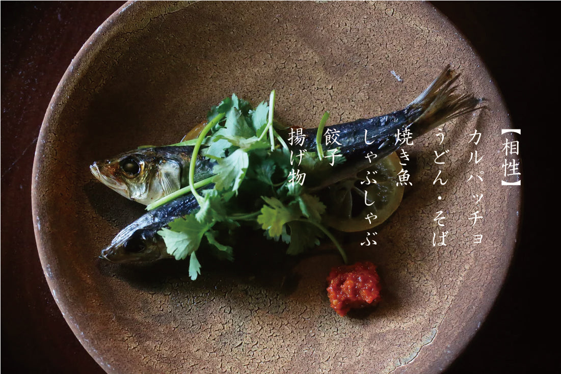 相性:カルパッチョ、うどん・そば、焼き魚、しゃぶしゃぶ、餃子、揚げ物