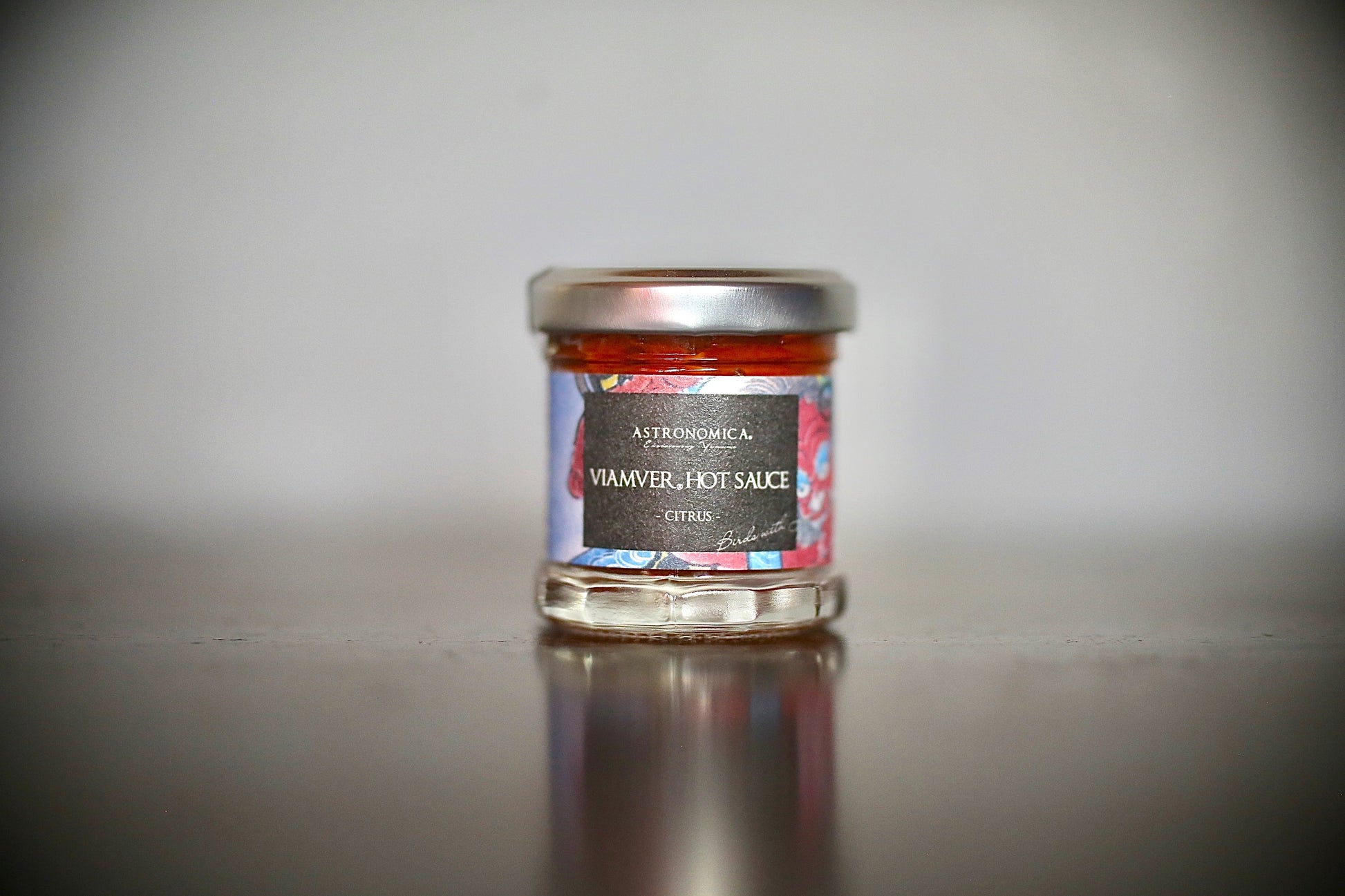 うま味を醸成するViamver酵母を作用させたシトラス香るホットソース。辛味と柑橘の香りとタンニンの渋み、コハク酸のうま味と西洋だしをあわせた発酵調味料。辛味を食事のアクセントに。