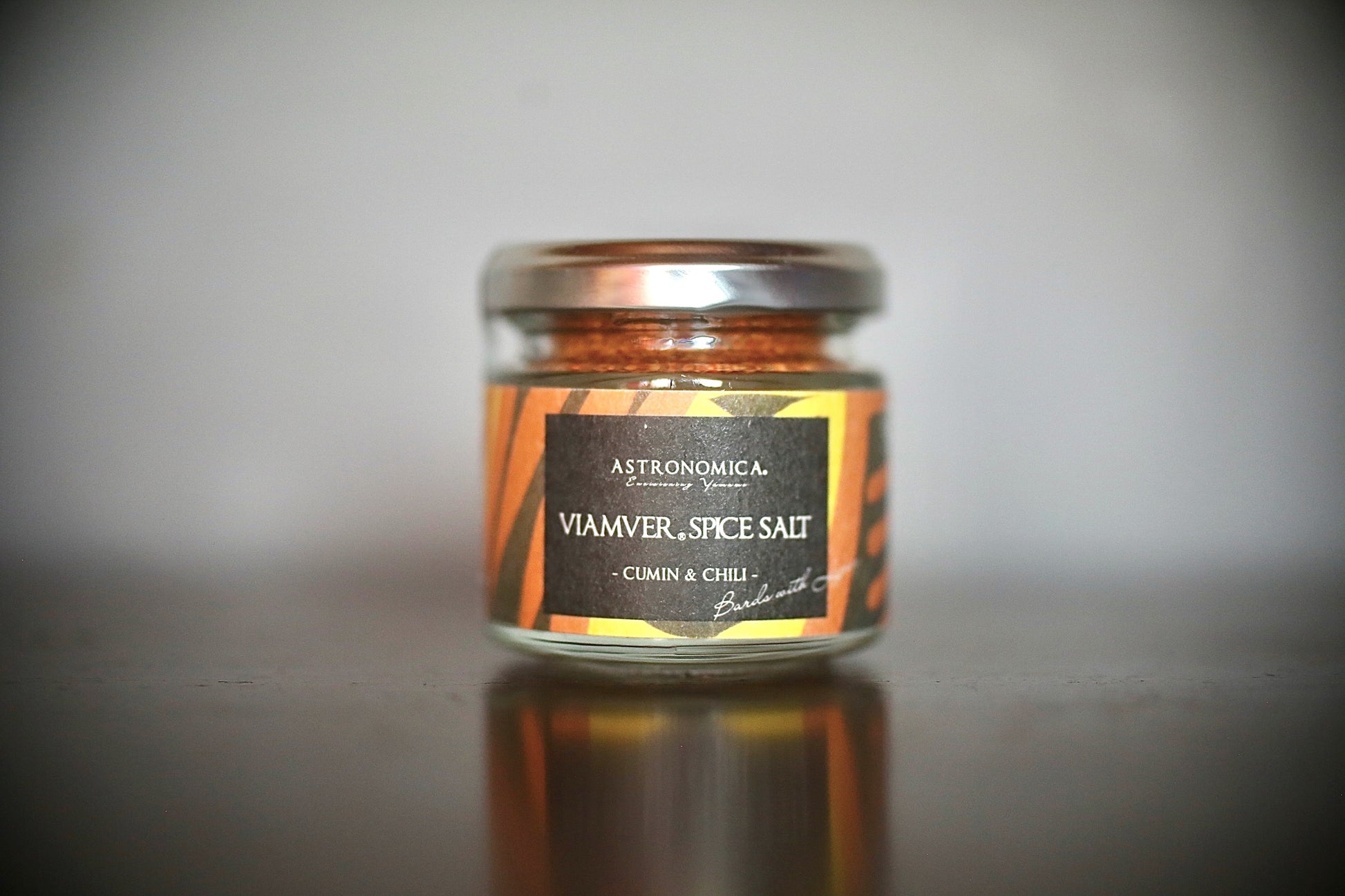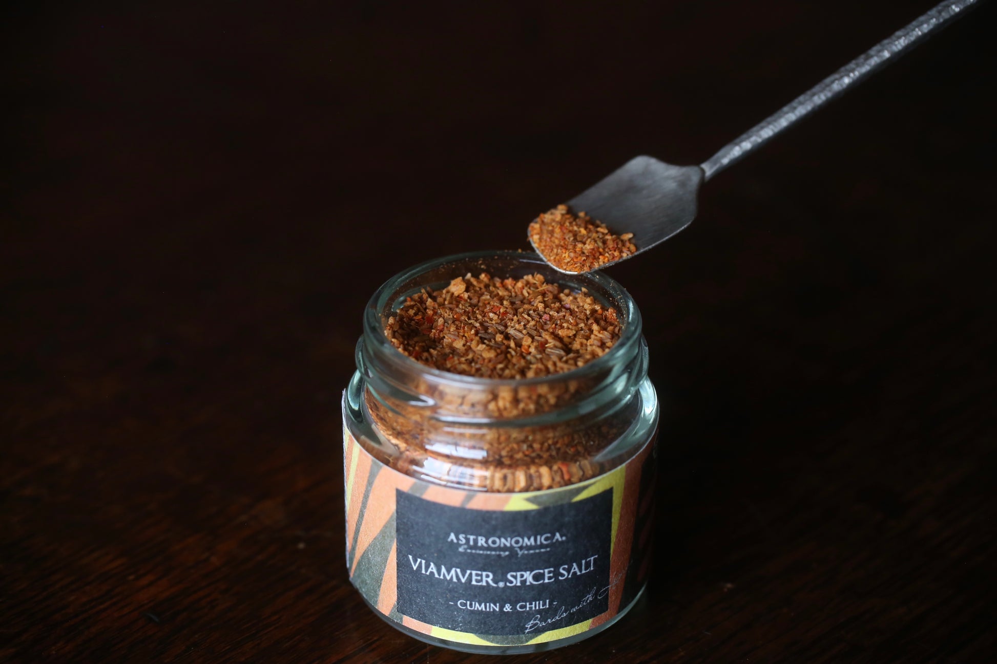 クミンと唐辛子、Viamver Saltのベーシックなスパイスソルト。野菜のマリネやカレー、肉魚料理など汎用性が高く、他のスパイスを加えてアレンジすることも。